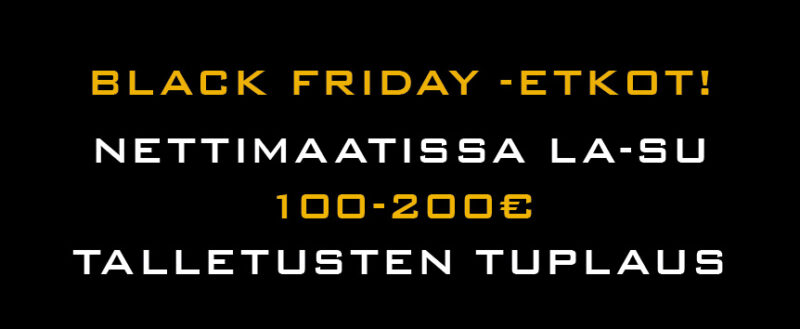 Black Friday -etkot! Viikonloppuna 100€-200€ talletusten tuplaus!Black Friday -etkot 22.-23.11.! Tuplauskrediitit maksetaan vihjetilille viimeistään maanantaina 24.11. klo 09.